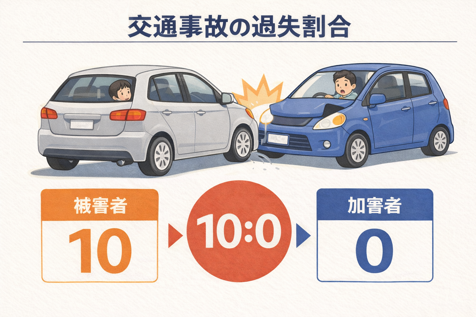 過失割合10対0とは、事故の責任が100%相手側にある状態をいいます。典型例としては、